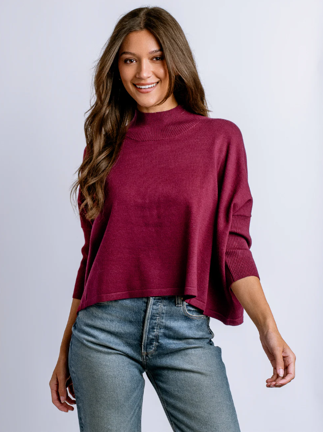 Boxy mock neck 3/4 sleeve top in solid color with rib hem accents