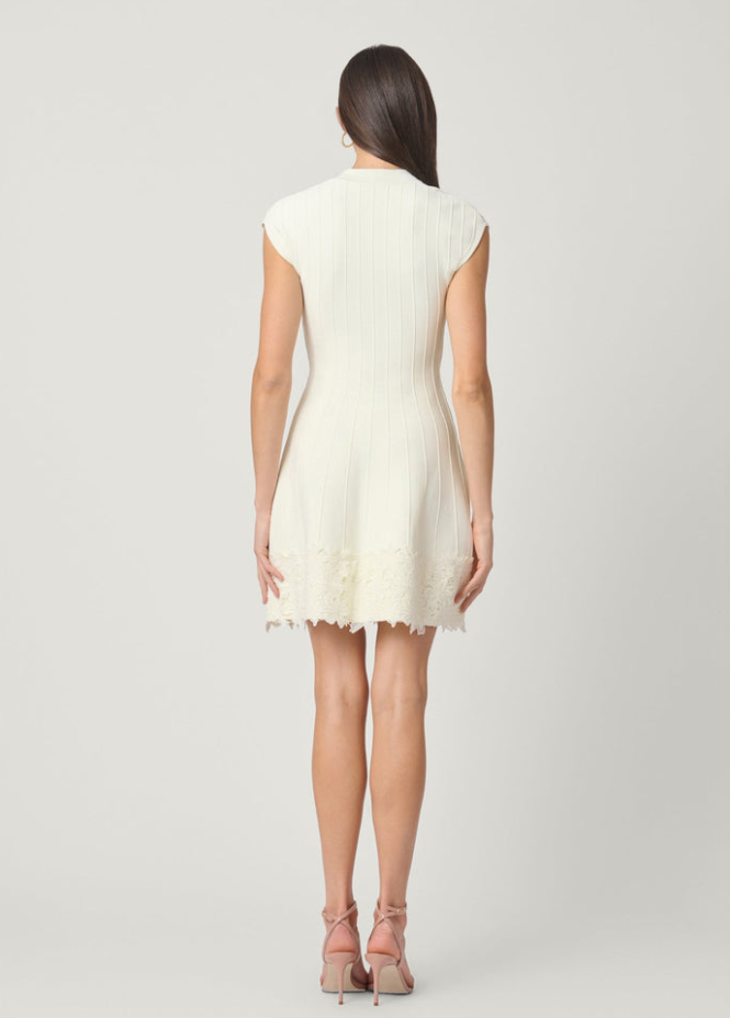 Elegant V-neck knit dress with a fitted bodice and a flared skirt. The V-neck slightly hugs the sides of the neck for a sleek look, and the hemline is accentuated with matching scalloped lace. The body is knit with an ottoman stitch for added texture. Slight cap sleeve effect. Unlined.