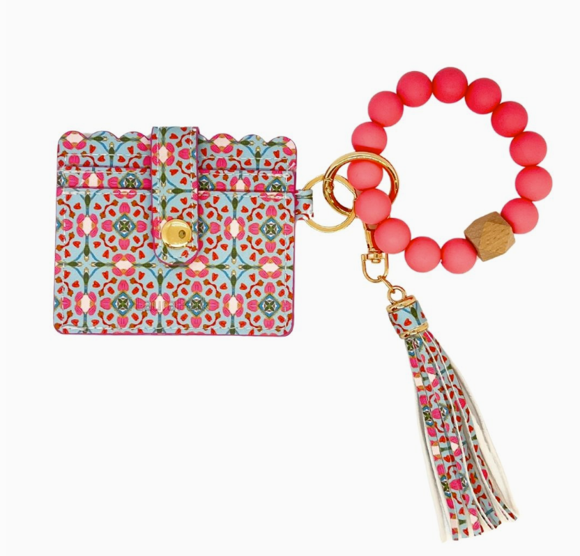 Stay stylish on-the-go with our wristlet keychain wallets – perfect for the do-it-all woman. Colorful silicone beads and a hexagonal wood accent offer mobility and convenience. Slip them on/off while running errands. This 3-in-1 accessory holds essentials like ID, credit card, cash, and keys. The leathered scallop design and chic tassel make a bold statement for gals with style. - Wallet size: 4.3" X 3.7" -PU Leather -Gold Hardware -Imported -Wipe clean with a damp cloth