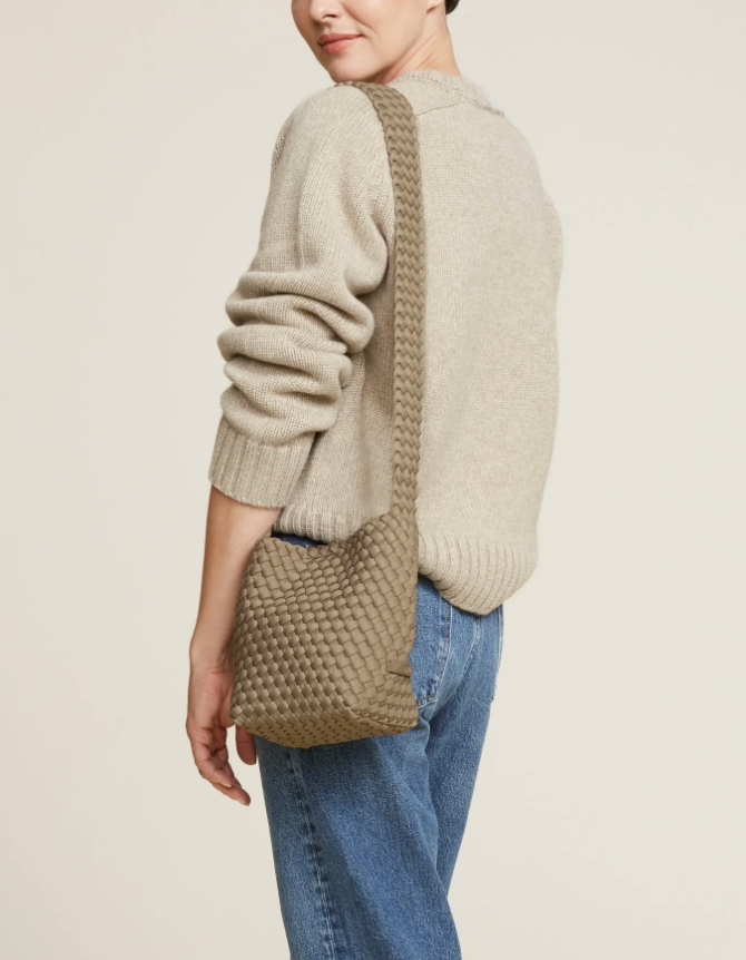 Handwoven neoprene in taupe. The Laguna crossbody is lightweight and comfortable to wear all day, hands-free.