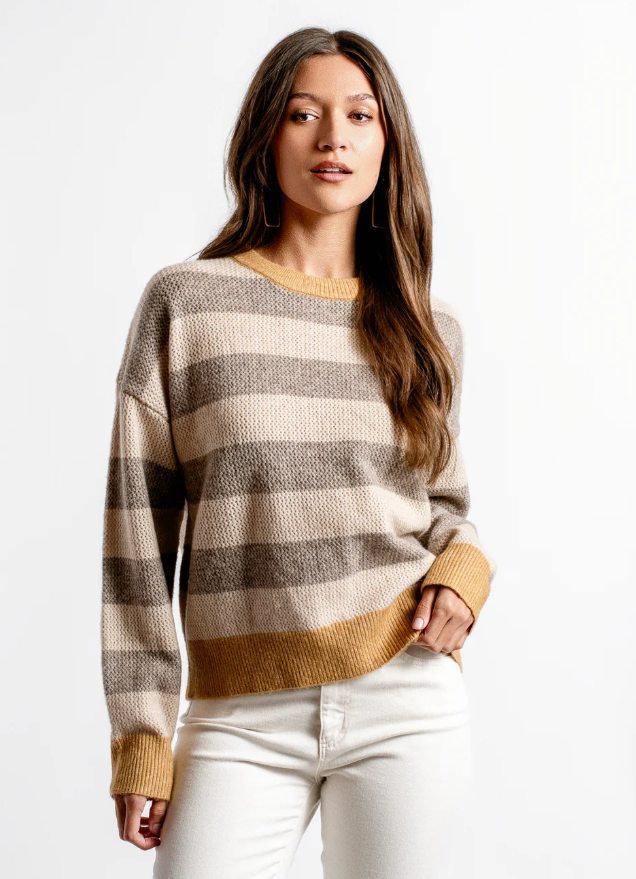 Crew neck long sleeve sweater in 3-tone stripe color blocking in criss-cross stitch