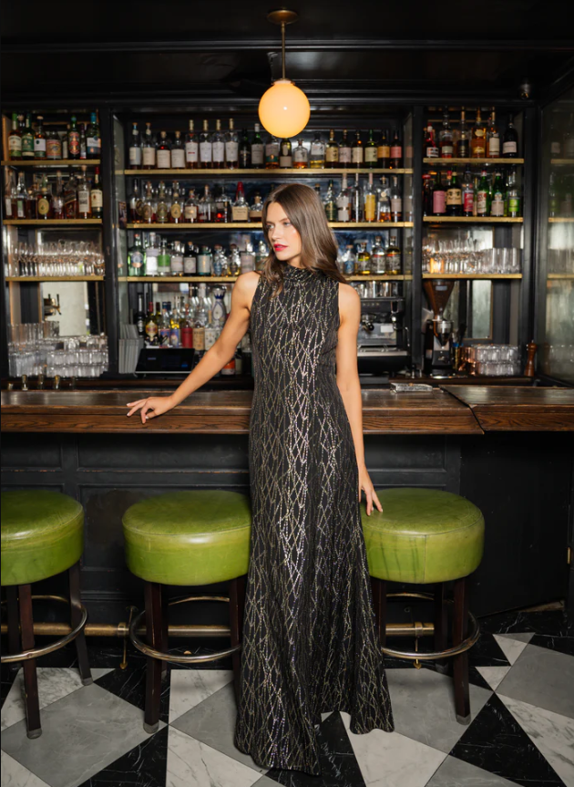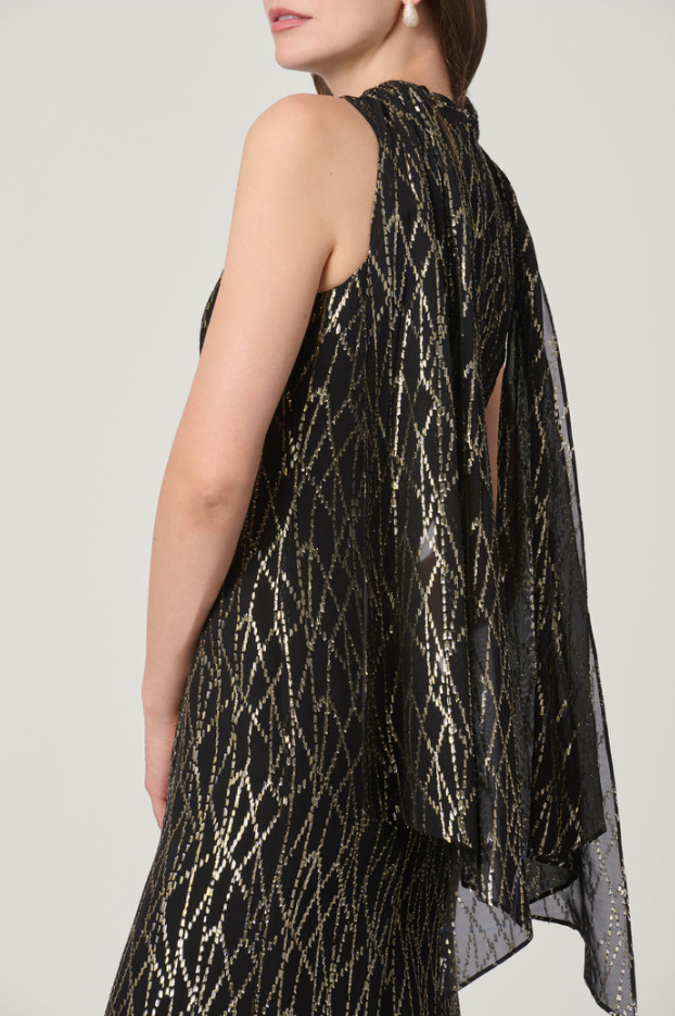 This stunning evening gown is made in a beautiful metallic chiffon fabric. The neckline has draping with a back sash detail, and the body is sleek and clean. The bodice is fitted and the skirt flares out around the knee area. Fully lined with a center back invisible zip closure.