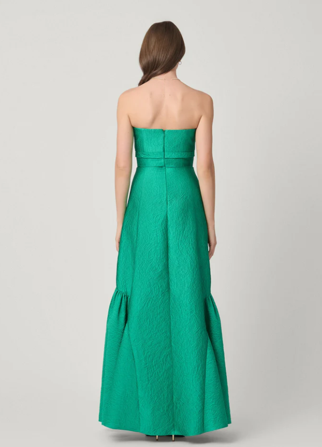 This elegant gown is fitted with an empire waistline. The A-line skirt is accentuated with voluminous side panels. This style is lined with an interior bustier for added support. Center back invisible zipper closure.