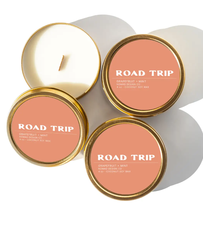 Road Trip is a fun and complex summer fragrance that we enjoy year-round! It’s a bright and enjoyable blend of tangy grapefruit, garden-fresh mint, leathery thyme, crisp apple, bold citrus, and grounding bergamot. A perfect fragrance to bring you right under that warm summer sun we need after a long Minnesota winter! Scent Notes: Grapefruit, garden-fresh mint, apple. Our travel tin candles are perfect for those who love to travel without missing the comforts of home. Bring your favorite scent with you anywhere you go. The size of these candles makes them perfect for packing in your luggage or taking on weekend getaways. Our candles are made with all-natural coconut soy wax and a crackling wood wick. We use premium fragrance oil that is phthalate-free, paraben-free, non-toxic and gluten-free. Each travel tin is hand poured into a 4oz gold tin. Approximately 20 hours of burn time. Size: 4oz. Tin Height: 1.1" Tin Diameter: 3.2"