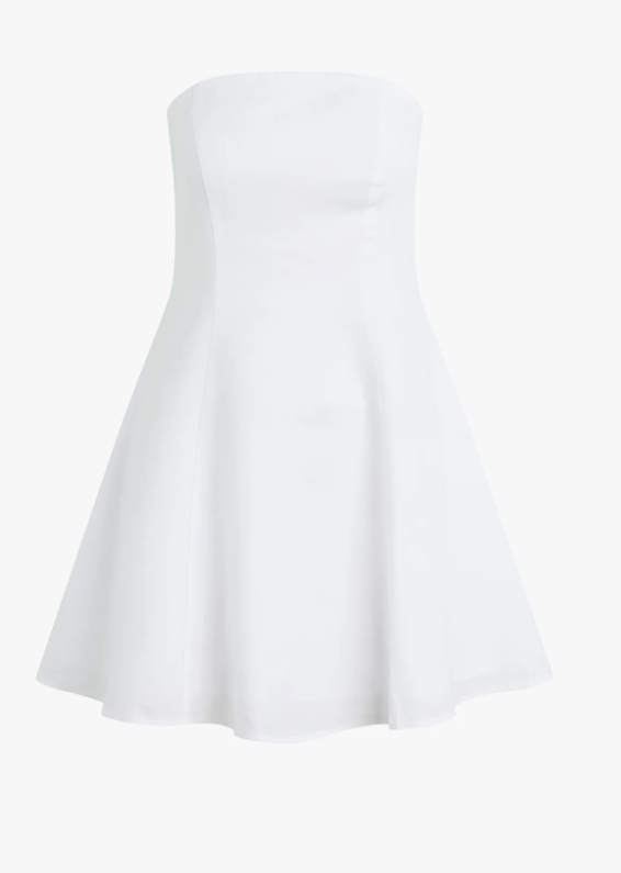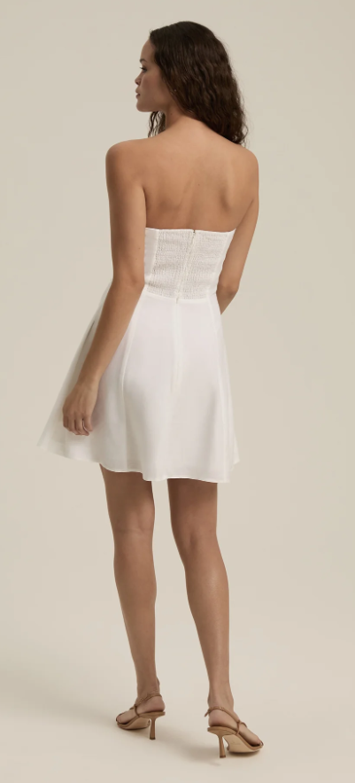 Timeless styling is what truly makes this linen-blend mini a favorite. Designed with a 34.5" length, classic strapless neckline, comfortable back smocking, an invisible back zipper--and, of course, side pockets (!)