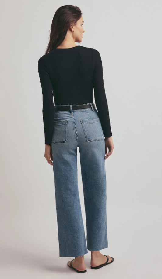 Relax, we've got you. The relaxed wide leg, wide hem Mischa jean has a vintage-blue stonewash and hits at the ankle. There are no front pockets for a clean silhouetteand the hint of stretch means that this soft denim will hold its shape and structure.
